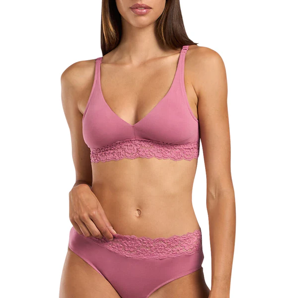 Design: Triangle bra with a solid color and lace detailing at the bottom.